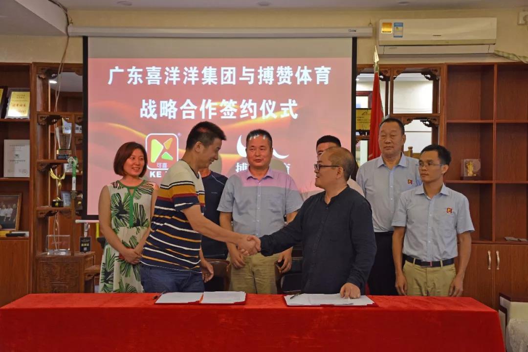 广东喜洋洋与搏赞体育战略合作签约仪式近日在喜洋洋总部举行,广东喜洋洋董事长周正强先生、党支部书记向胜开先生等领导和搏赞体育总经理吴征兵先生、副总经理斯国松先生等领导出席了签约仪式。